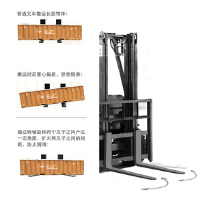 一项调查显示,大约有28%的人在使用叉车时会遇到用为被搬运的物体太长而发生侧滑问题。此叉车设计通过转轴结构,使两个叉子之间产生一定角度,转轴旋转控制两叉臂的间距,从而解决了搬运时发生侧滑的问题。产品造型灵感来自于一种昆虫——蚱蜢:犹如蚱蜢之臂强健有力。