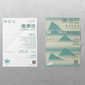 标志的外形选用空间的常见外观,向传统建筑屋脊外观靠拢,在左右两侧切角。由中间向外采用渐变的方式表达表明.本禅疗体验馆的主旨:拨开云雾见光明,即通过禅文化的方式,疗愈用户的内心,清除用户内心困饶已久的杂念 • 颜色方面,选用清水蓝,白色为主要颜色由这两个颜色渐变,选用清水蓝这个颜色,即寓意着希望用户来到清念禅愈体验馆能够心如止水,清除杂念,回归自己,疗愈内心