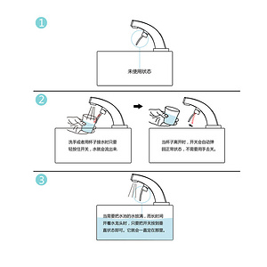 此款水龙头的设计灵感来自饮料机的出水口。当我们用杯子压着开关时水自动流出,当杯子离开时出水口便自动关闭。因此,我们可以单手操作开关水龙头,更不会忘关水龙头,便利了生活,减少了不必要的浪费。