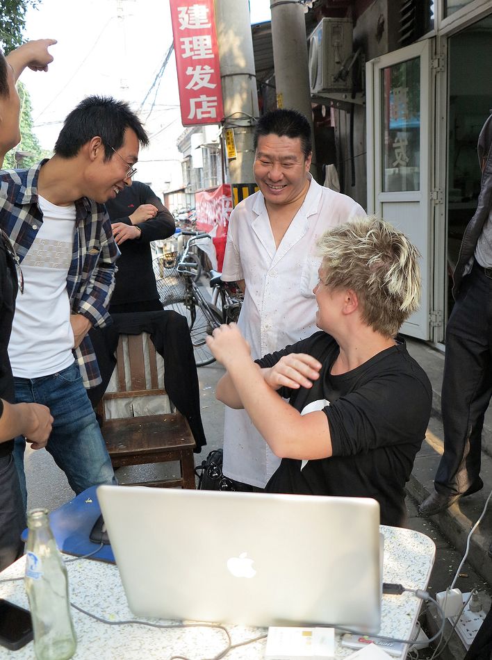 然后走街串巷,驻扎小胡同,用笔记本电脑在热闹的人群中为一些商家免费做标识。